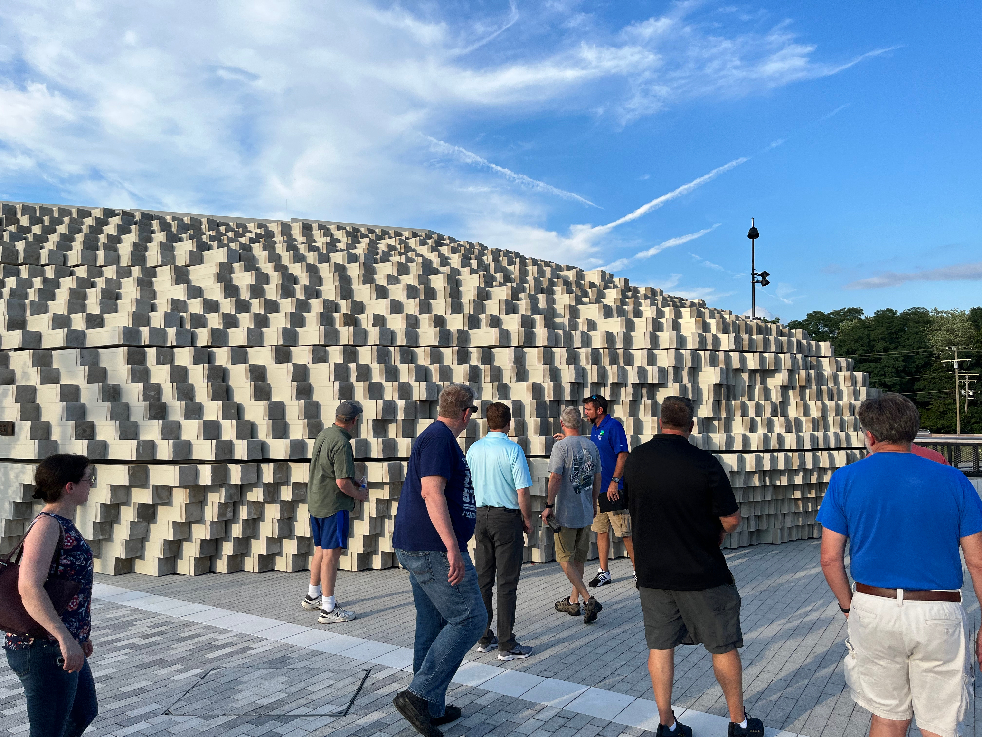 Following the opening presentation, the attendees split into three groups to rotate through different sections of the facilities. The first of these groups moved to an outdoor courtyard area to view and listen to a three-speaker landscape loudspeaker system produced by Klipsch, featuring a half-buried subwoofer (unburied for the demo) and a network-controlled amplifier and DSP unit with 110° coverage area.