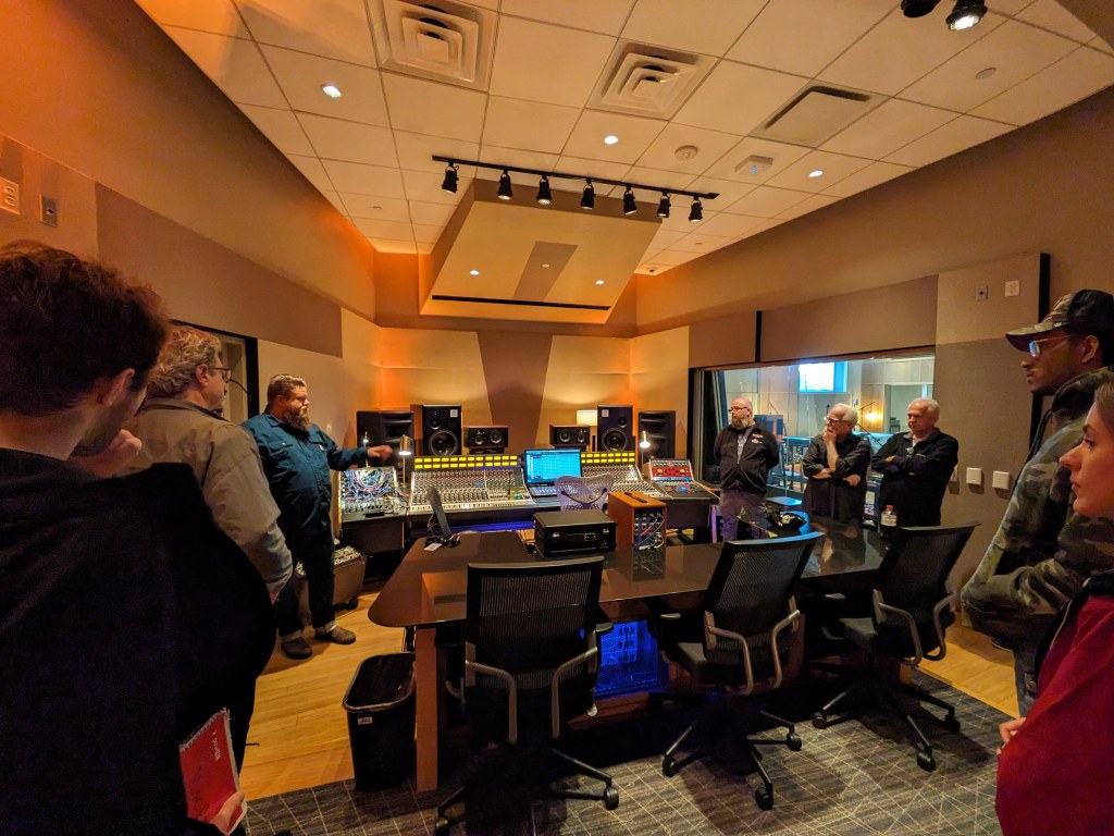 Sweetwater Studios opened its doors to the Indiana Section of the AES and audio enthusiast in the area for a technical tour and discussion of immersive production. The tour began with a look inside the studio’s expansive mic locker, which features well over 100 makes and models, most in pairs or more. From there the group moved into Studio A, the primary tracking room in the facility. The control room features a Neve 5088, a substantial collection of outboard gear, and multiple pairs of stereo monitors housed in a comfortable, creative environment. The adjacent tracking space and two iso booths were set from a recently concluded progressive rock recording session, allowing for a look at the day-to-day recording practices employed at the studio.